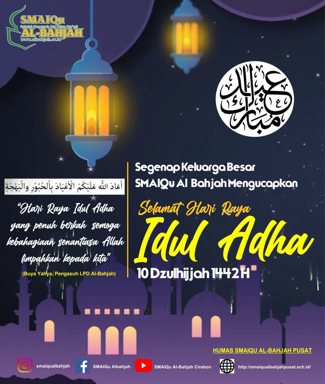 Segenap Keluarga Besar SMAIQu Al-Bahjah Pusat, mengucapkan Selamat Hari Raya Idul Adha 10 Dzulhijjah 1442 H.