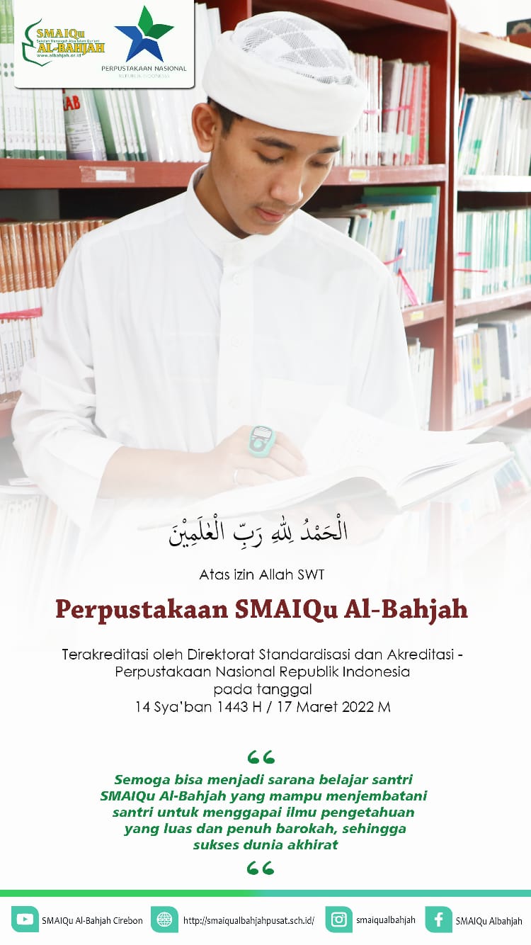 Alhamdulillahirabbil'alamiin, atas izin Allah SWT, perpustakaan SMAIQu Al-Bahjah telah *terakreditasi oleh Direktorat Standarisasi dan Akreditasi Perpustakaan Nasional Republik Indonesia* pada tanggal 14 Sya'ban 1443 H / 17 Maret 2022 M.