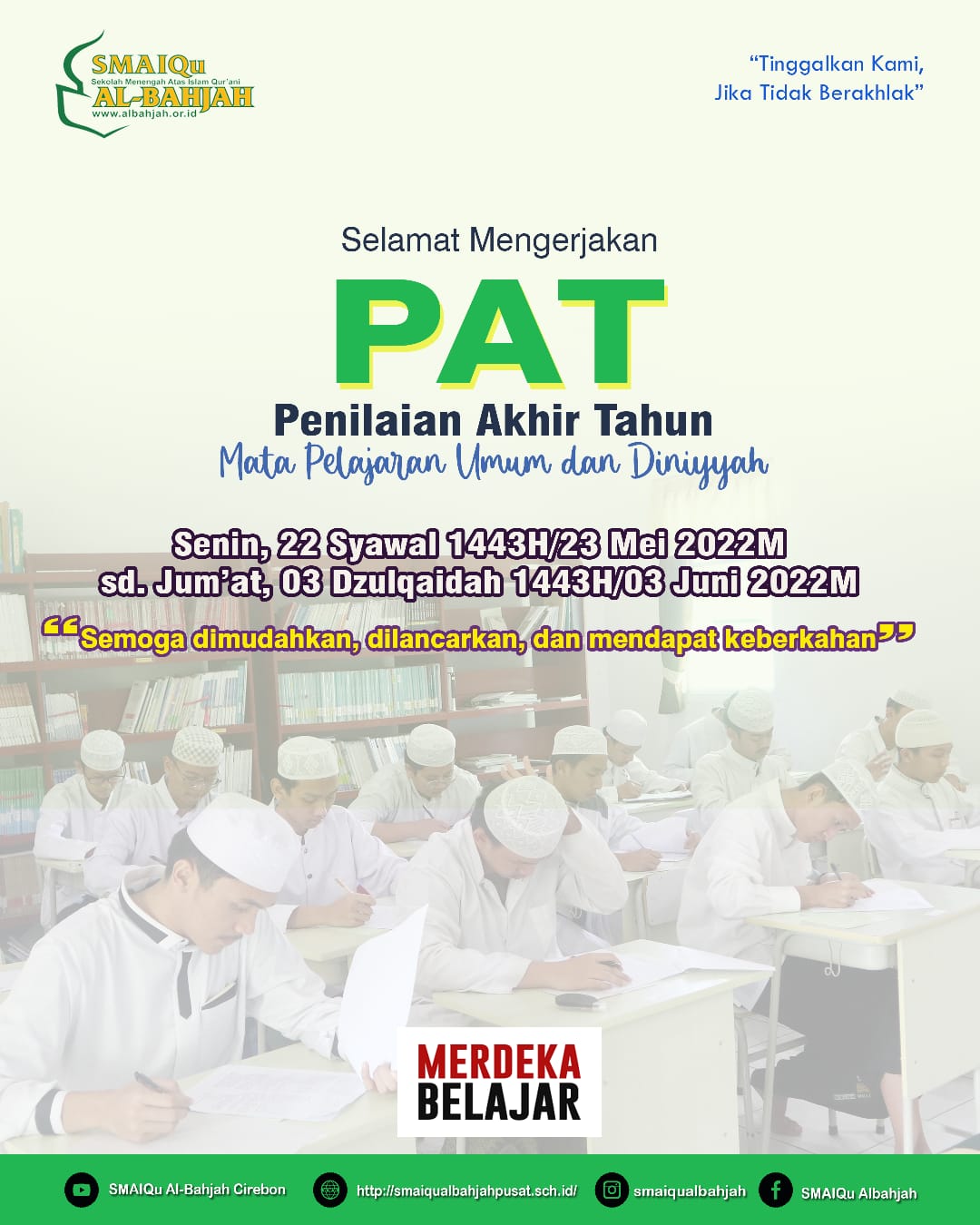 Mohon doanya orang tua kami, insya Allah seluruh santri SMAIQu Al-Bahjah Pusat akan menempuh *Penilaian Akhir Tahun (PAT)*. Mulai tanggal 22 Syawal - 03 Dzulqaidah 1443 H atau bertepatan dengan tanggal 23 Mei- 03 Juni 2022 M.