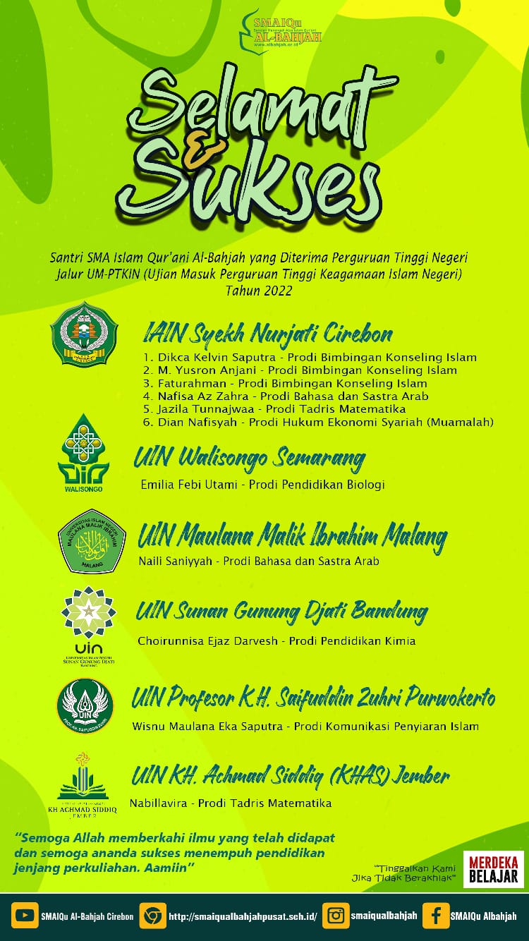Selamat atas diterimanya lulusan Santri SMAIQu Al Bahjah Pusat Cirebon Angkatan ke-4 di Perguruan Tinggi Negeri Islam, Jalur  UM-PTKIN Pilihan