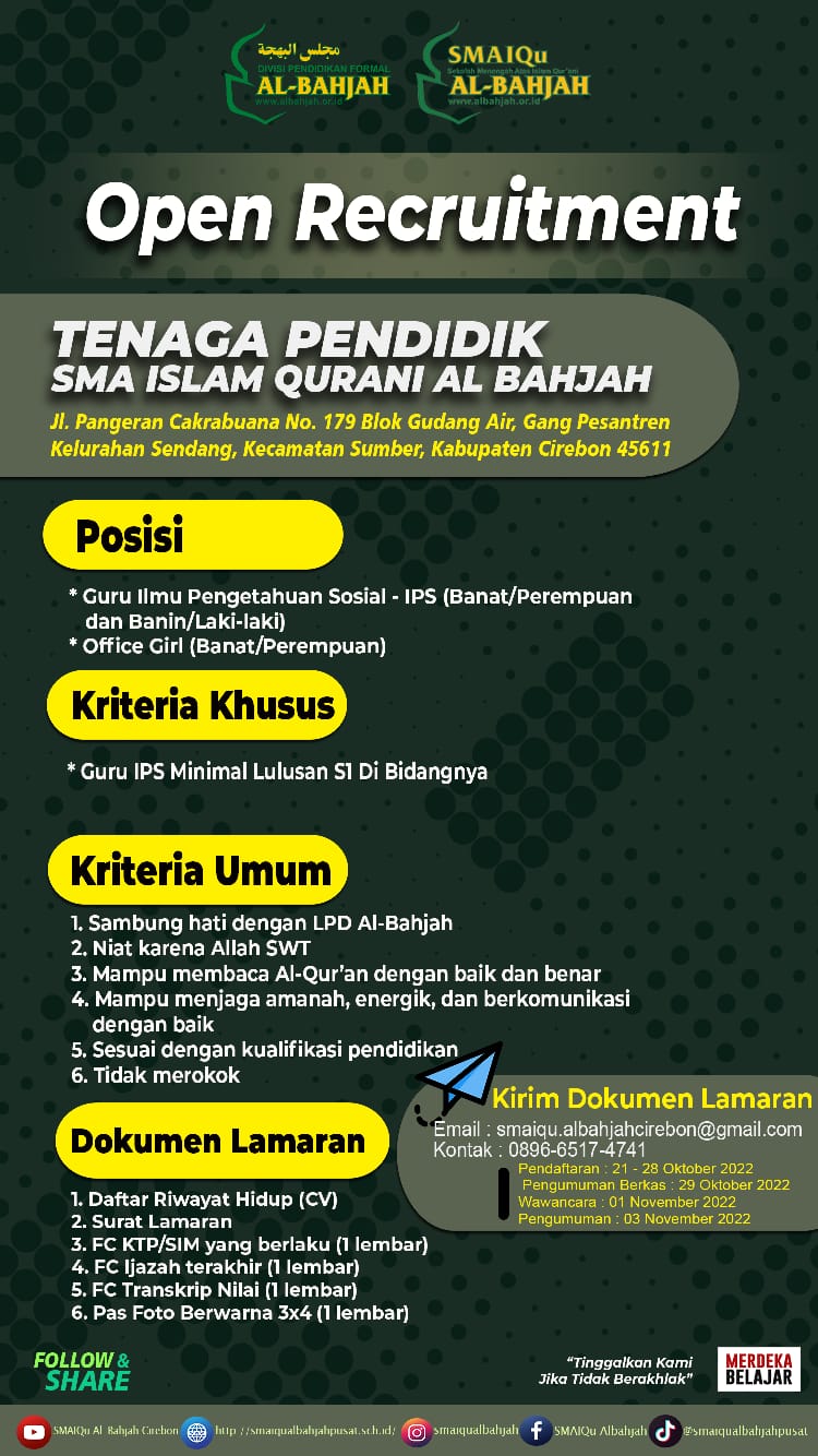 SMAIQu Al Bahjah Cirebon* mengundang Para Pejuang Dakwah di bidang Pendidikan untuk andil dalam perjuangan dakwah Rasulullah SAW.