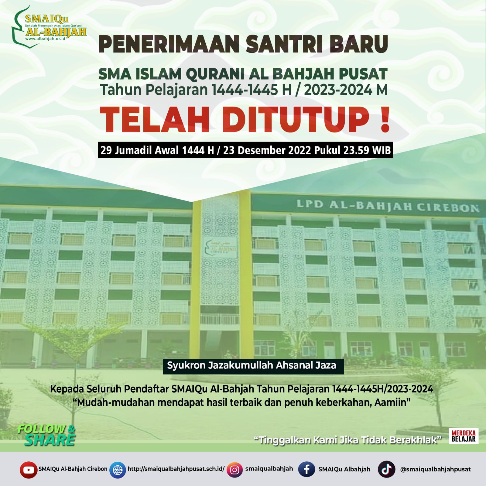 RESMI DITUTUP PENDAFTARAN SANTRI BARU di SMAIQu Al Bahjah Pusat Cirebon Tahun Pelajaran 1444-1445 H / 2023-2024.