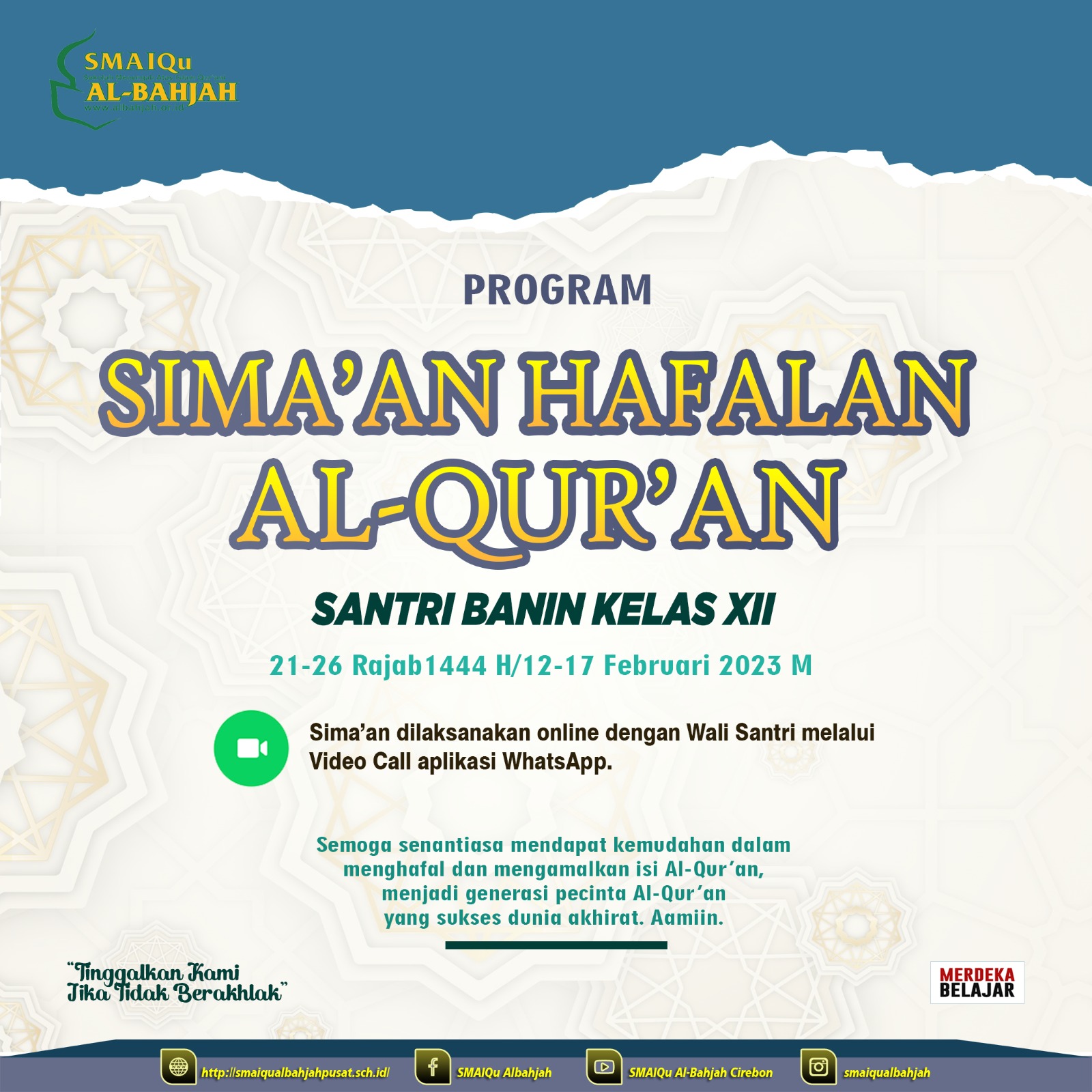 Mohon do'anya orang tua kami, insya Allah Santri Kelas XII Banin SMAIQu Al-Bahjah Pusat akan melaksanakan: