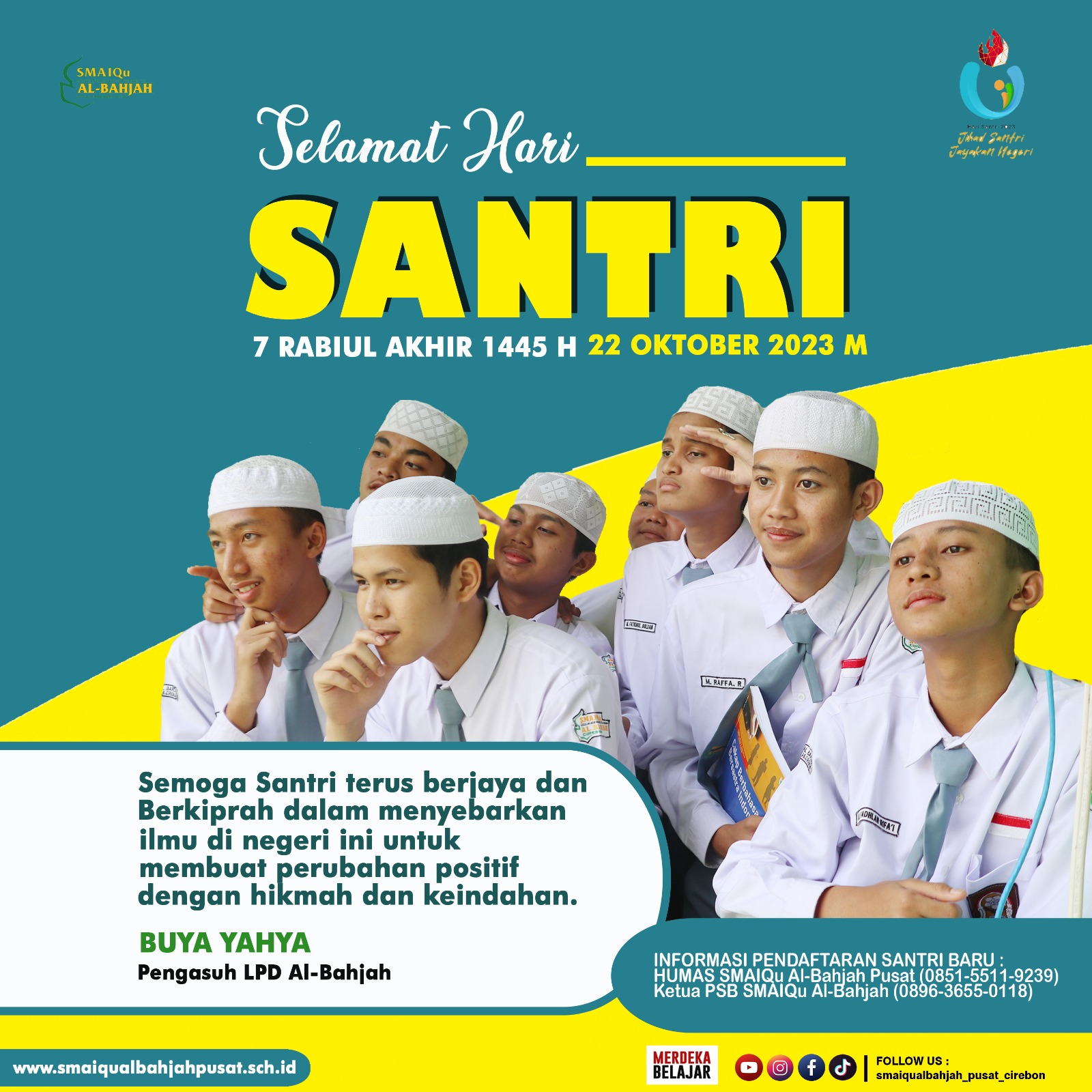 “Semoga Santri terus Berjaya dan Berkiprah dalam menyebarkan ilmu di Negeri ini untuk membuat perubahan positif dengan Hikmah dan Keindahan  ". (Buya Yahya-Pengasuh LPD Al Bahjah).