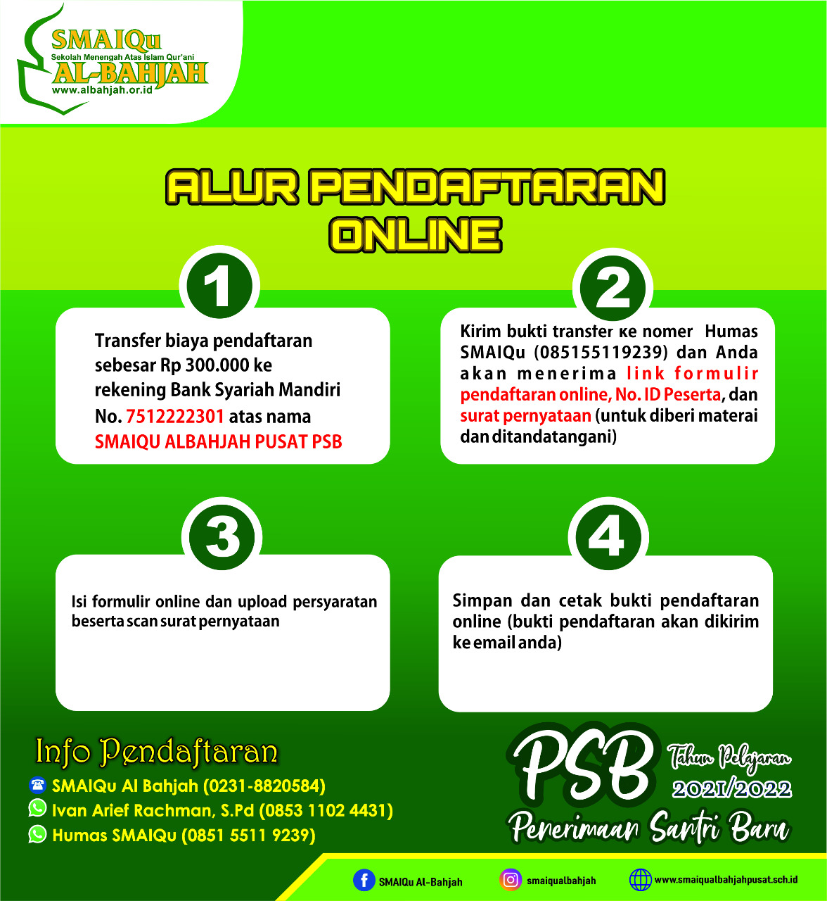 1. Transfer biaya pendaftaran sebesar Rp. 300.000,- ke rekening Bank Syariah Mandiri: 7512222301. An SMAIQu Al Bahjah Pusat PSB