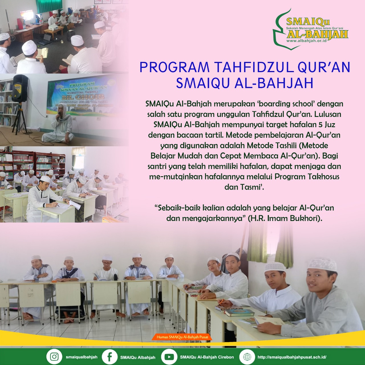 SMAIQu Al-Bahjah merupakan boarding school dengan salah satu program unggulannya adalah Tahfidzul Qur'an. Lulusan SMAIQu mempunyai target hafalan 5 juz dengan bacaan yang tartil. Metode pembelajaran Al-Qur'an yang digunakan adalah metode Tashili (Metode belajar mudah dan cepat membaca Al-Quran). Bagi santri yang sudah memiliki hafalan, dapat menjaga dan me-mutqinkan hafalannya melalui program takhosus dan tasmi'.