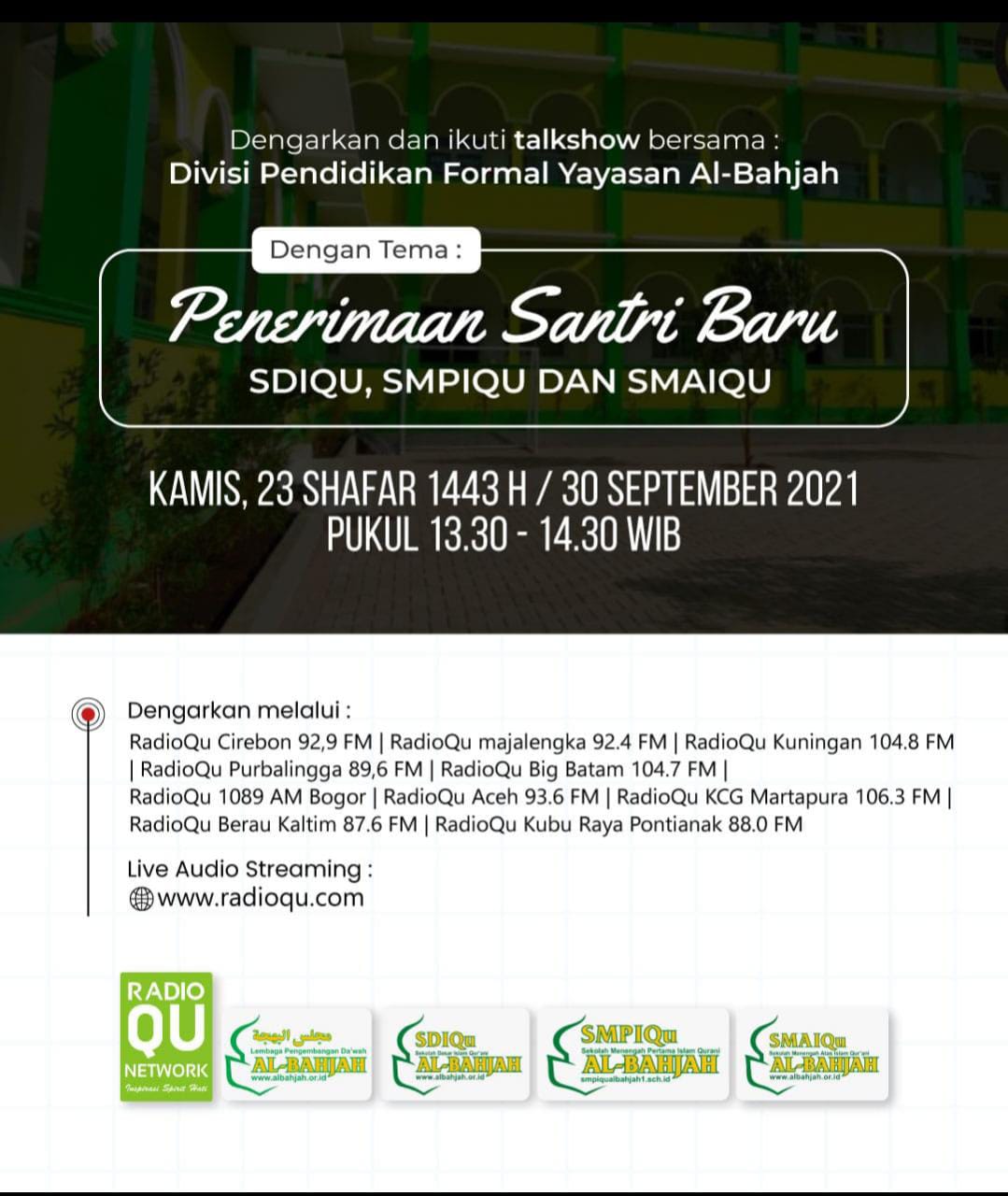 Mari ikuti Talk Show Penerimaan Santri Baru Divisi Pendidikan Formal Al-Bahjah (SDIQu, SMPIQu, dan SMAIQu Al-Bahjah), yang insya Allah disiarkan melalui RadioQu network pada hari Kamis, 23 Shafar 1443 H / 30 September 2021 Pukul 13.30-14.30!