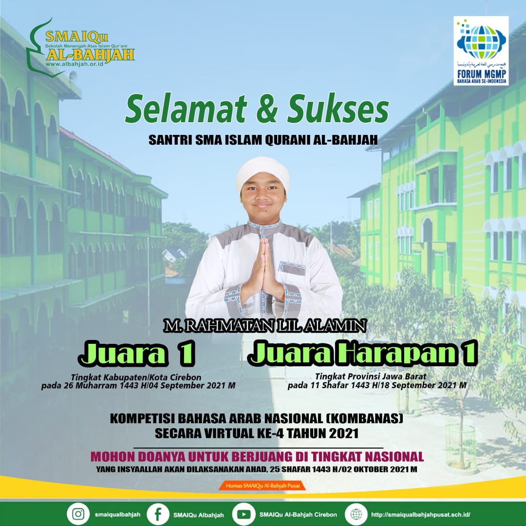 Alhamdulillah wa syukurillah atas izin Allah dan doa para walisantri, dua santri kami telah berjuang serta berpartisipasi dalam Kompetisi Bahasa Arab Nasional (KOMBANAS) secara Virtual Tingkat Kab./Kota Cirebon Tahun1443 H / 2021 M dan berhasil mendapatkan juara 1 dan juara 2.