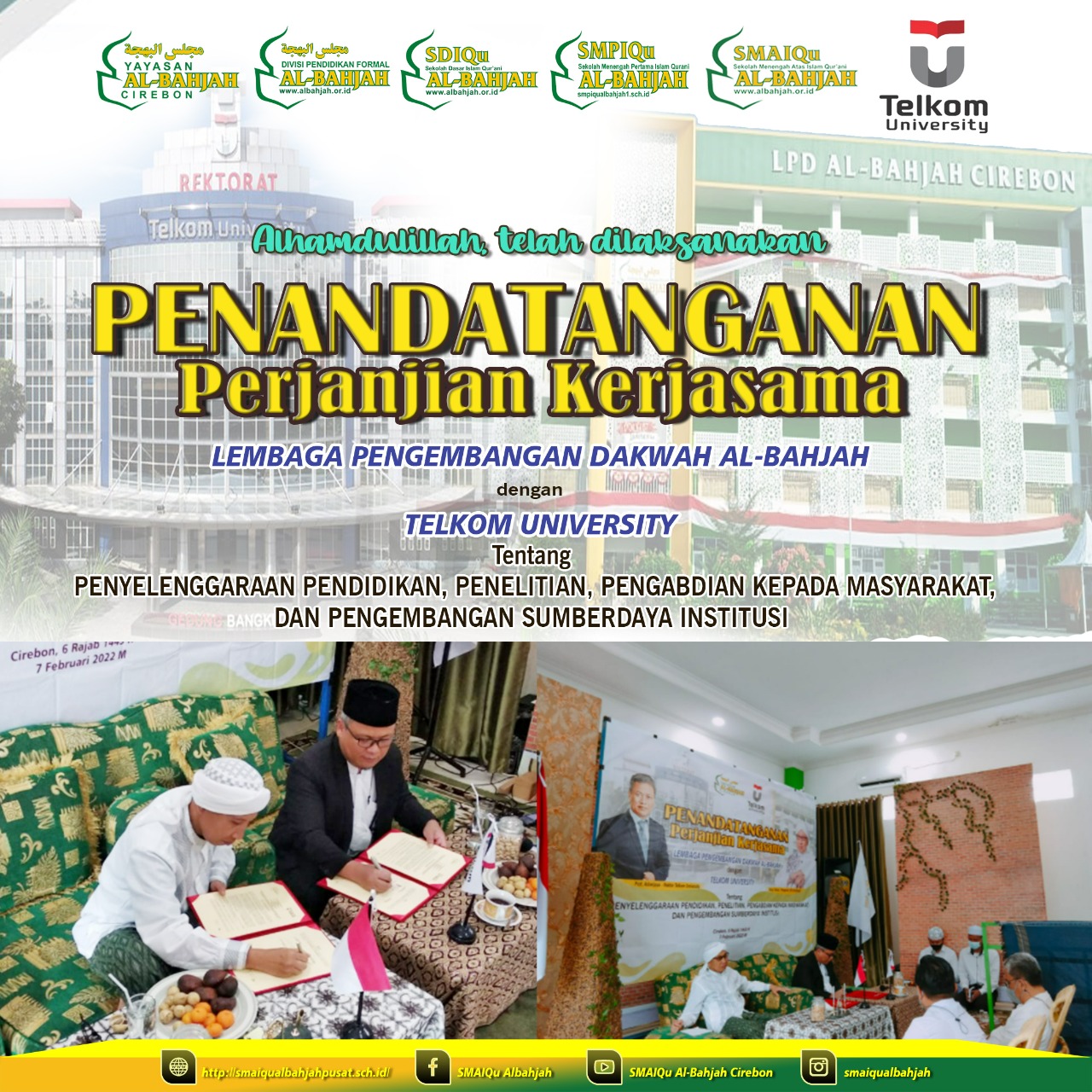 *Mengembangkan insan berilmu dan berakhlak berlandaskan Al-Qur’an, As-Sunnah, dan Aqidah Ahlussunnah wal Jama’ah*, pada tanggal 6 Rajab 1443 H/ 7 Februari 2022 M, LPD Al-Bahjah telah melakukan *penandatanganan perjanjian kerjasama dengan Telkom University* dalam bidang *Penyelenggaraan Pendidikan, Penelitian, Pengabdian kepada Masyarakat, dan Pengembangan Sumberdaya Institusi.*