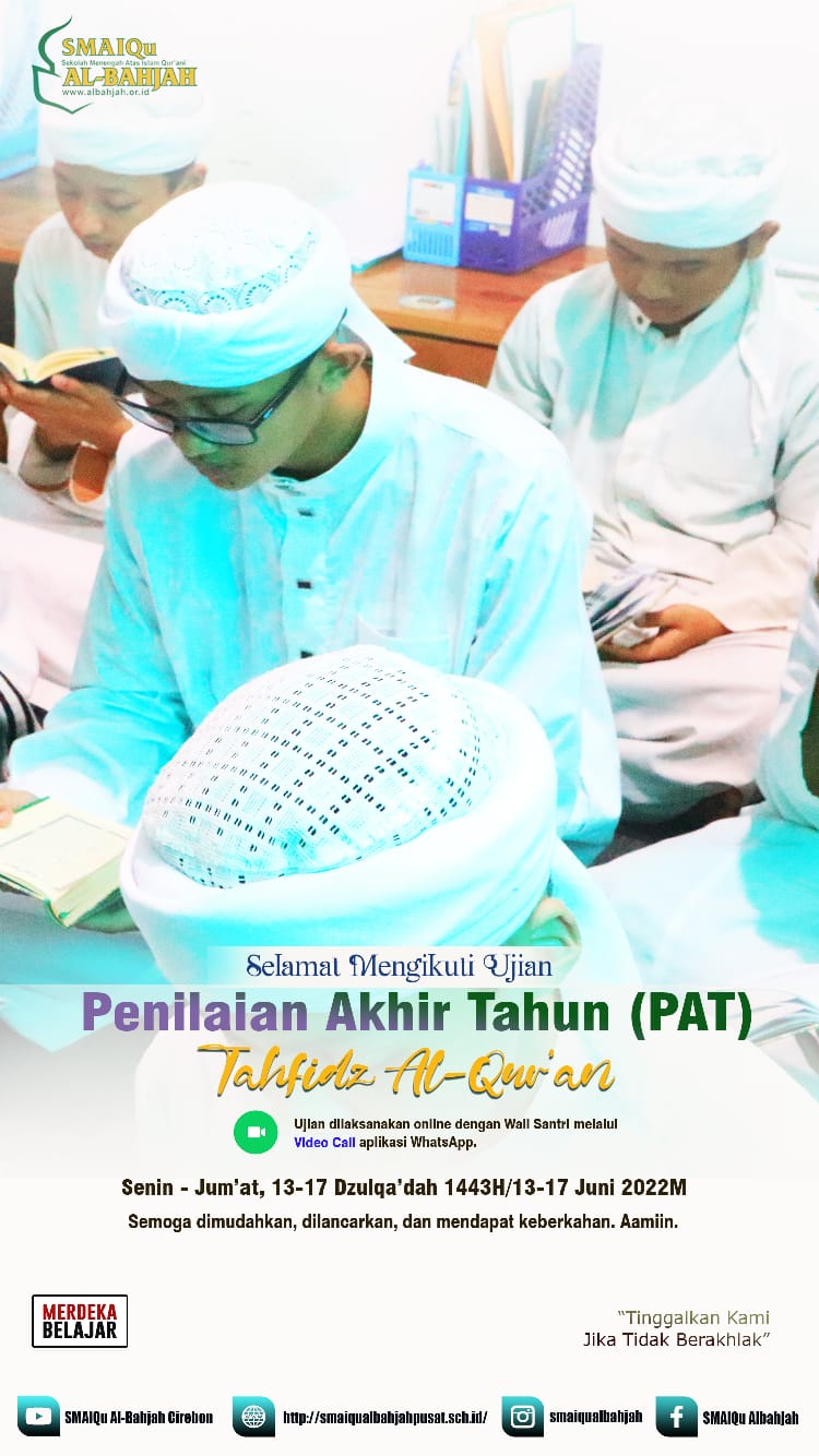 Mohon doanya orang tua kami untuk kemudahan para Santri Kelas X & XI akan melaksanakan Penilaian Akhir Tahun (PAT) Tahfidzul Qur'an pada Hari Senin - Jum'at, tanggal 13-17 Dzulqaidah 1443 H atau 13-17 Juni 2022 M.
