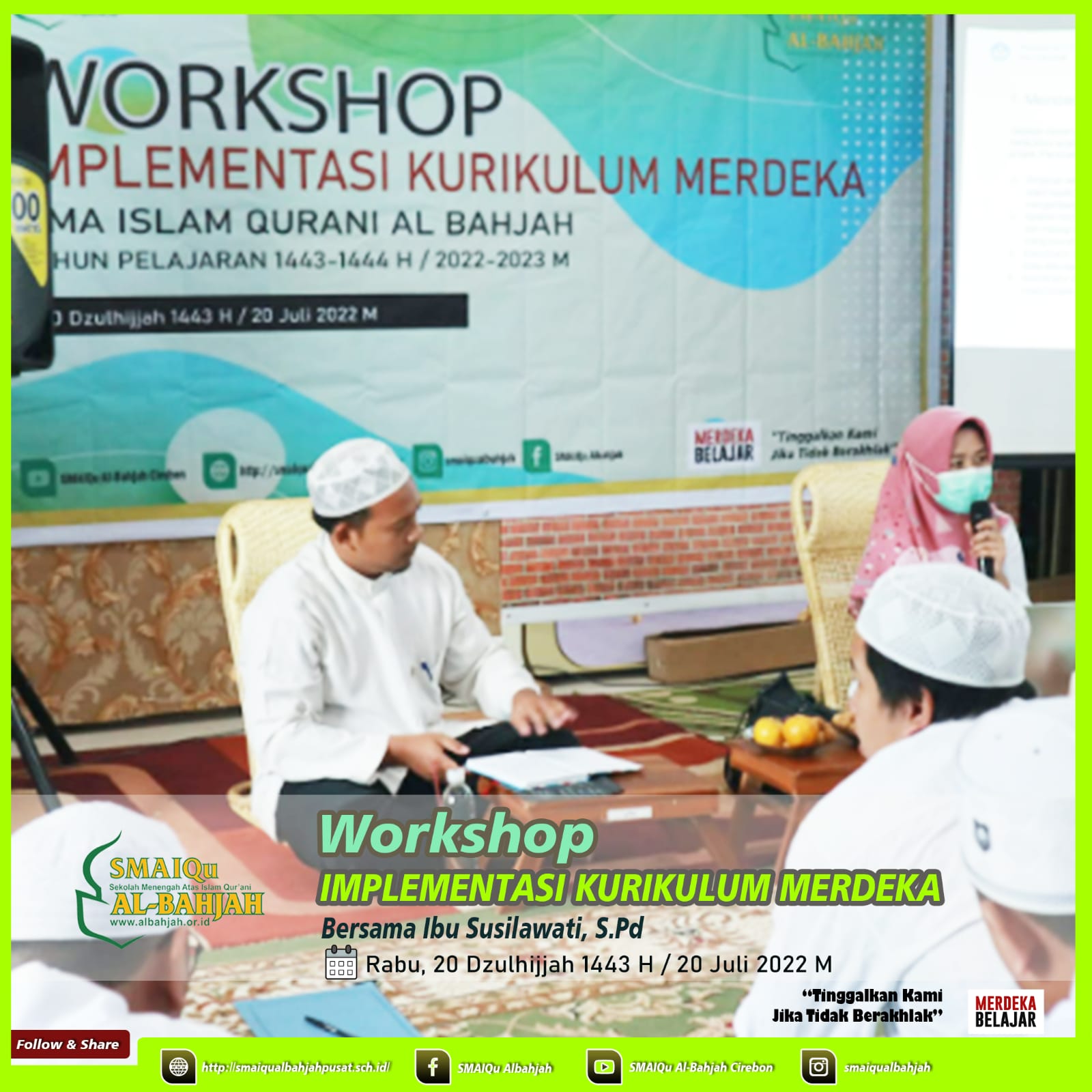 Telah dilaksanakan *Workshop "Implementasi Kurikulum Merdeka"* , pada tanggal 20 Dzulhijjah 1443 H/ 20 Juli 2022 M. Diisi Langsung oleh Pengawas SMAIQu Al Bahjah Pusat Cirebon, Ibu Susilawati, S.Pd.