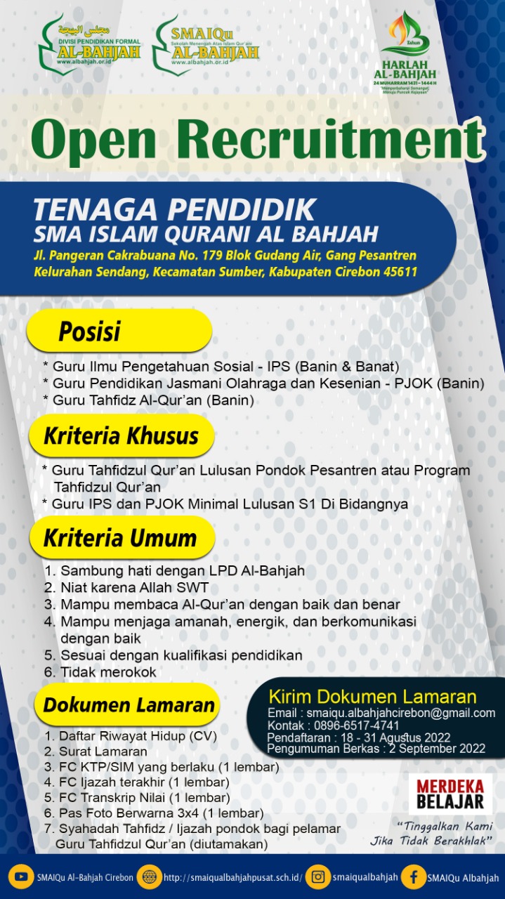 SMAIQu Al Bahjah Cirebon mengundang Para Pejuang Dakwah di bidang Pendidikan untuk andil dalam perjuangan dakwah Rasulullah SAW.