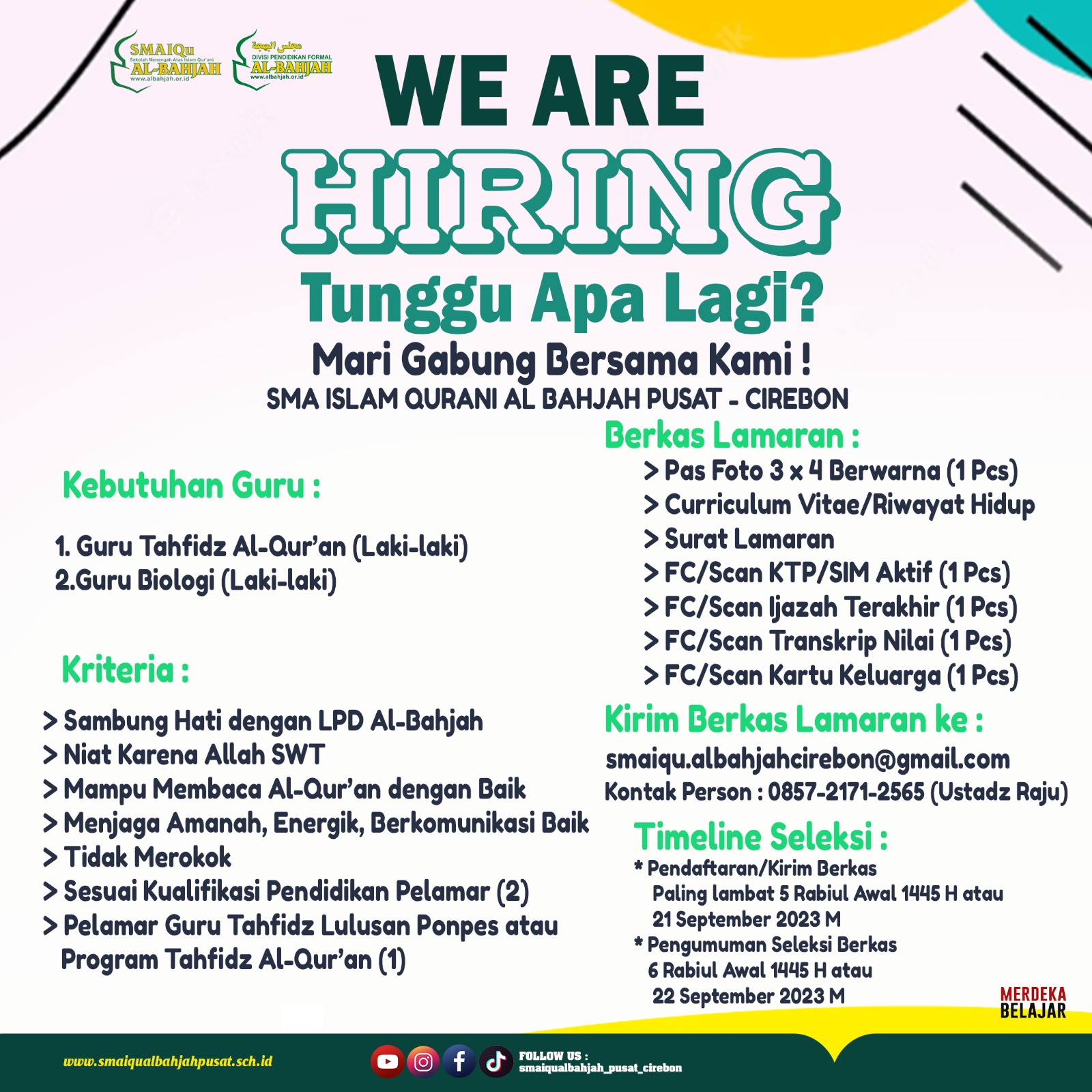 SMAIQu Al Bahjah Cirebon mengundang Para Pejuang Dakwah di bidang Pendidikan untuk andil dalam perjuangan dakwah Rasulullah SAW.