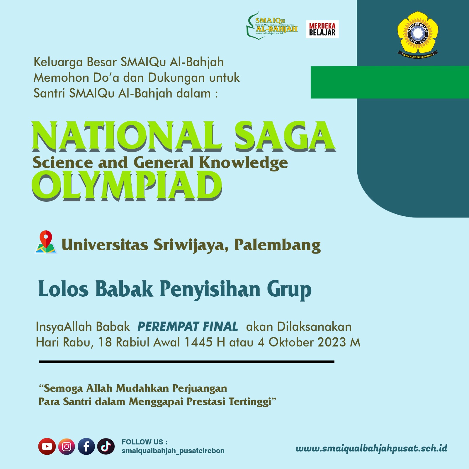 Mohon do'anya  Buya,,Ummi,, Para Asatidz, orang tua kami, para Walisantri, para santri,,untuk perjuangan selanjutnya insyaallah Babak Perempat Final, dilaksanakan Hari Rabu, 18 Rabiul Awal 1445 H/ 04 Oktober 2023. dan semoga bisa Memberikan Hasil yang terbaik