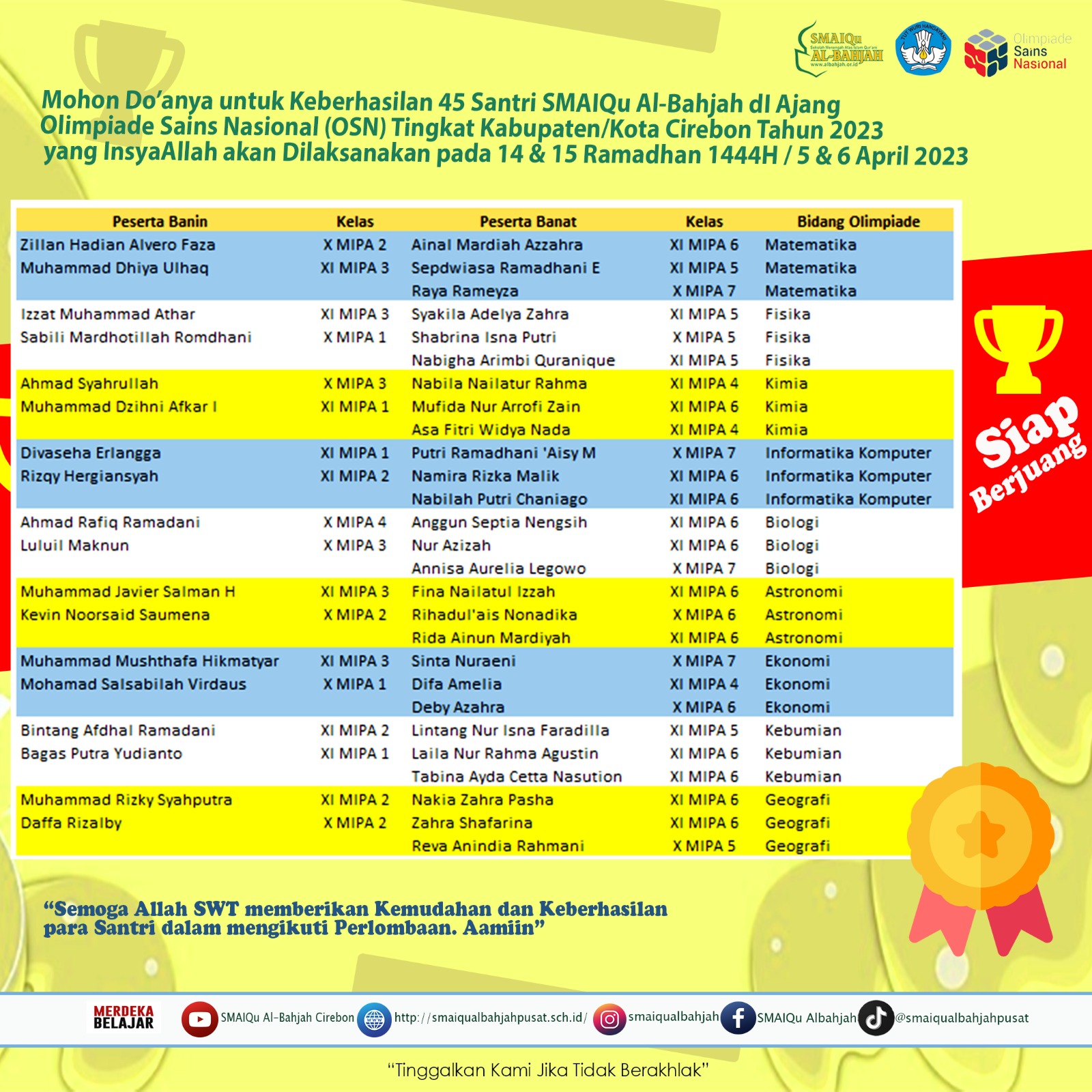 Insya Allah, pada tanggal 14 & 15 Ramadhan 1444 H / 5&6 April 2023, perwakilan dari santri SMAIQu Al-Bahjah sebanyak 45 Santri akan mengikuti kompetisi, Olimpiade Sains Nasional (OSN) Tingkat Kabupaten/Kota Cirebon Tahun 2023.