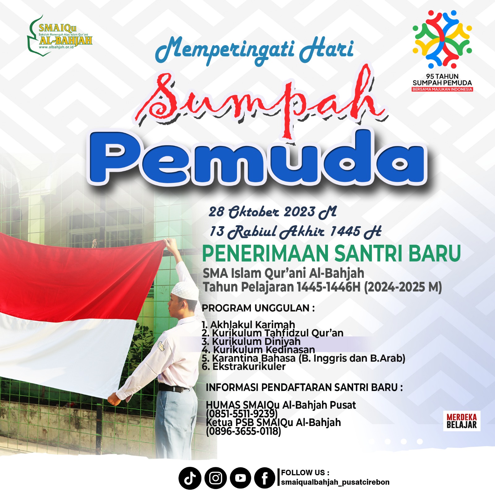Segenap keluarga besar SMAIQu Al-Bahjah Pusat mengucapkan Selamat Hari Sumpah Pemuda. Bersatu Bangun Bangsa . 28 Oktober